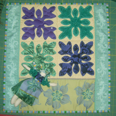 And since I have a lot of stuff for NewFO, I will share the Monthly Doll Quilt Swap piece that I sent to my partner.  The theme was 'Fantasy' along the Midsummer Nights Dream idea, but my partner and I agreed to make a guilt based on our dream wish.  Diane's was to go to Tahiti - so my Tahiti quilt and dollie to her.